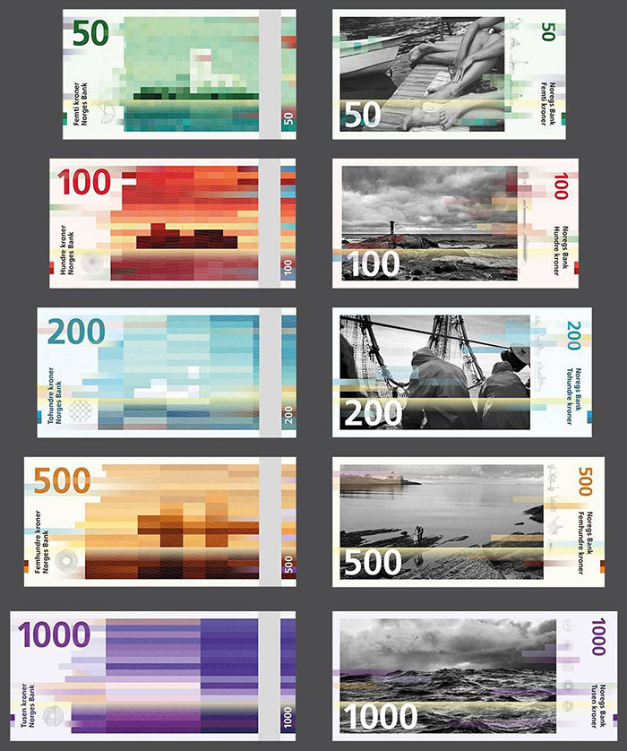 Денежной системе не один десяток лет, но купюры у разных стран в целом одинаковы. Поэтому глотком свежего воздуха стал новый дизайн норвежских крон. Дизайнеры из студий SNØHETTA DESIGN и The Metric System отошли от классических понятий и совместили пиксель-арт и морские пейзажи.